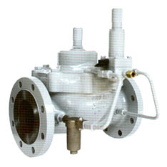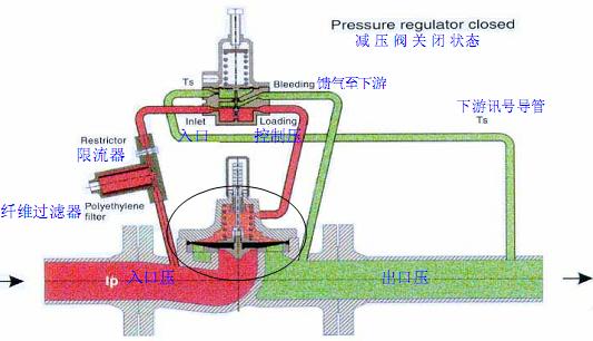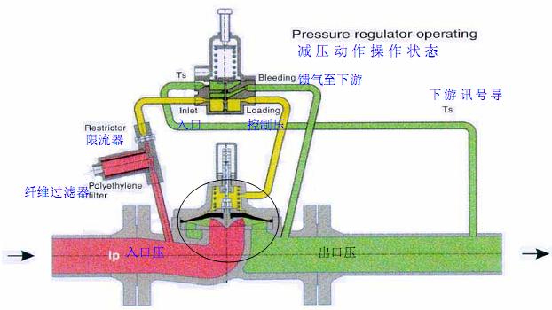 当减压阀下游有需求用量出现时,下游出口压力会下落,使得指挥器打开而开始使控制压因限流阀门作用,使主阀上层弹簧室排气快过进入主皮膜上侧,而减少在主皮膜上侧的力量,致使在主皮膜下侧入口压力逐渐举起皮膜,打开阀门来满足减压阀下游有需求用量。