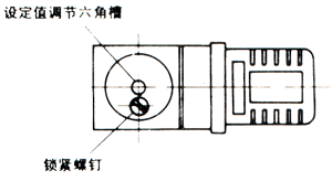 ◆ 松开锁紧螺钉,用5mm内六角螺钉扳手,顺时针旋动设定值调节螺六角槽,使设定值由小变大,直至开关触点在8MPa处切换;